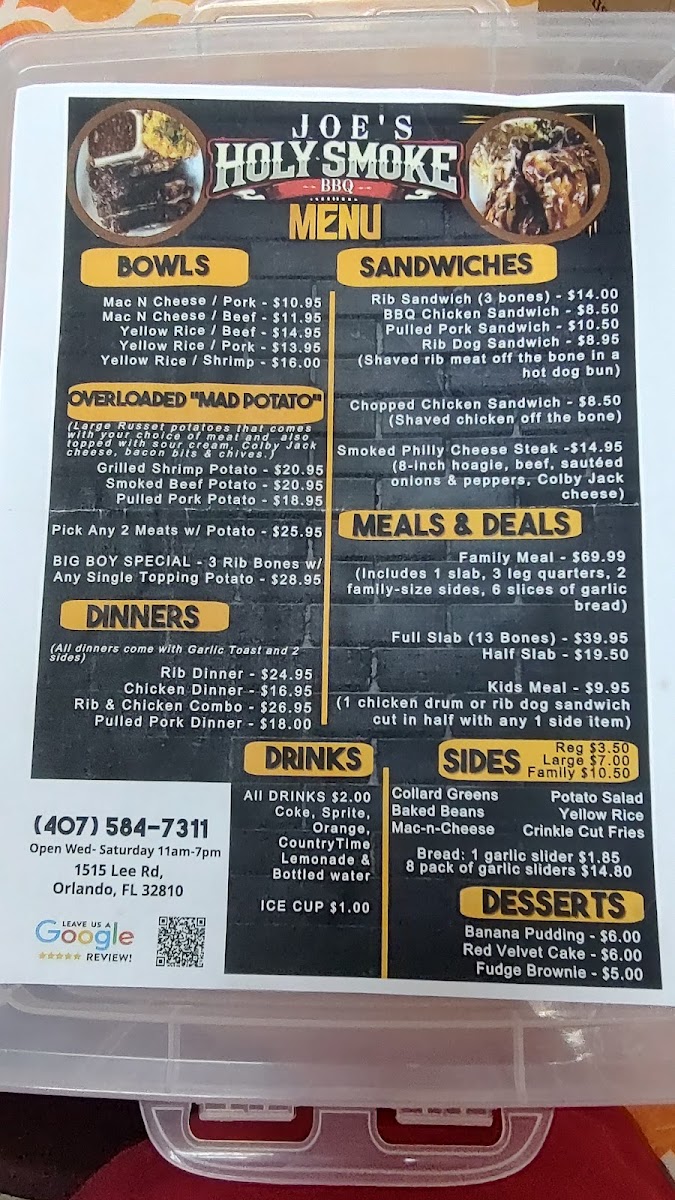 Joe's Holy Smoke Bbq Menu feels like the kind of lineup you stumble upon once and immediately want to tell your friends about. Tucked over on 1515 Lee Rd in Orlando, this spot serves up the kind of BBQ that hits you first with the smell, then with the flavor. As you look through the menu, you’ll notice how everything leans into that slow-smoked, comfort-food vibe - ribs with just enough char to make them irresistible, brisket that practically falls apart, and pulled pork that tastes like it’s been tended to all day.